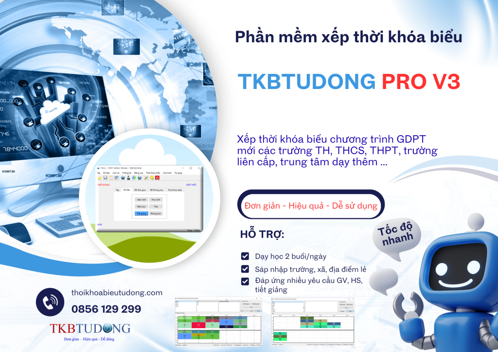 “Đáp ứng yêu cầu xếp TKB GDPT mới. Phần mềm TKBTUDONG là một giải pháp thông minh và tiện lợi cho việc xếp thời khóa biểu cho các trường phổ thông ở Việt Nam.”